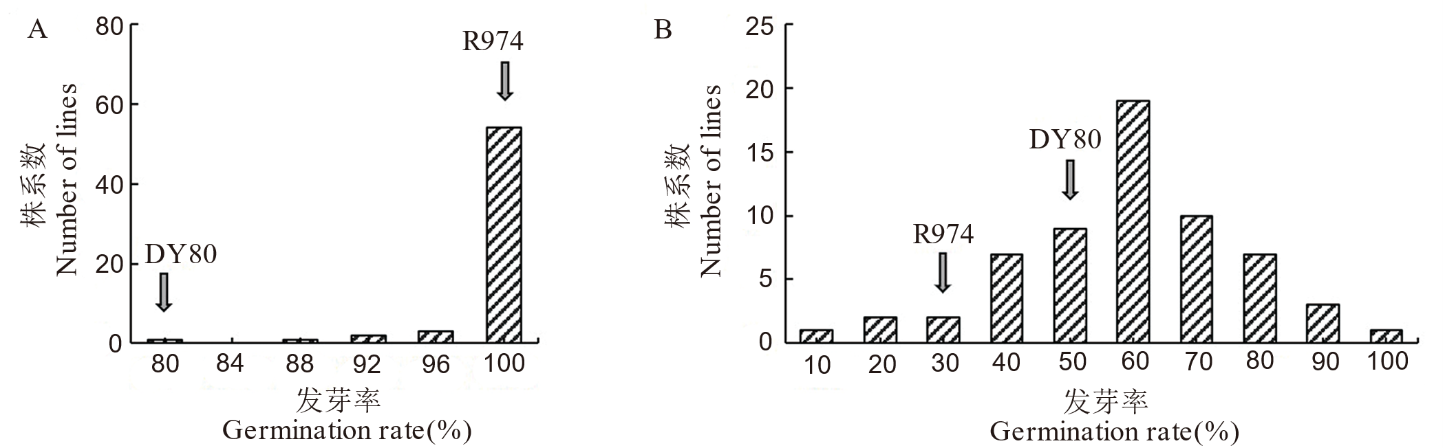 图1 BG群体的表型分布 A:正常萌发试验的表型分布;B:人工陈化处理后的表型分布。