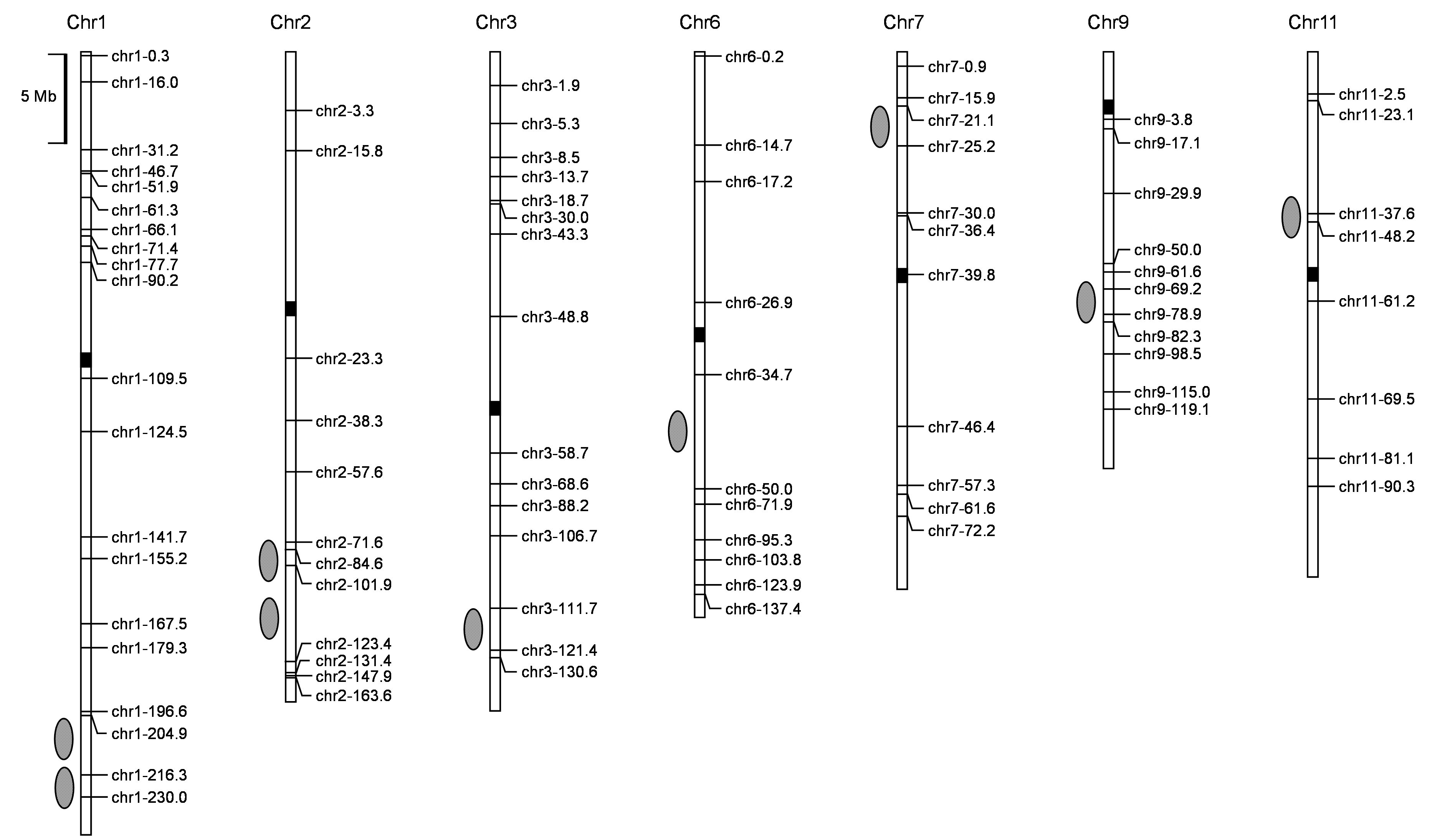 | 染色体 Chromosome | 起始位置 Start position (bp) | 终止位置 Stop position (bp) | 长度 Length (bp) | 基因数量 Gene number | 已克隆基因 Cloned gene |