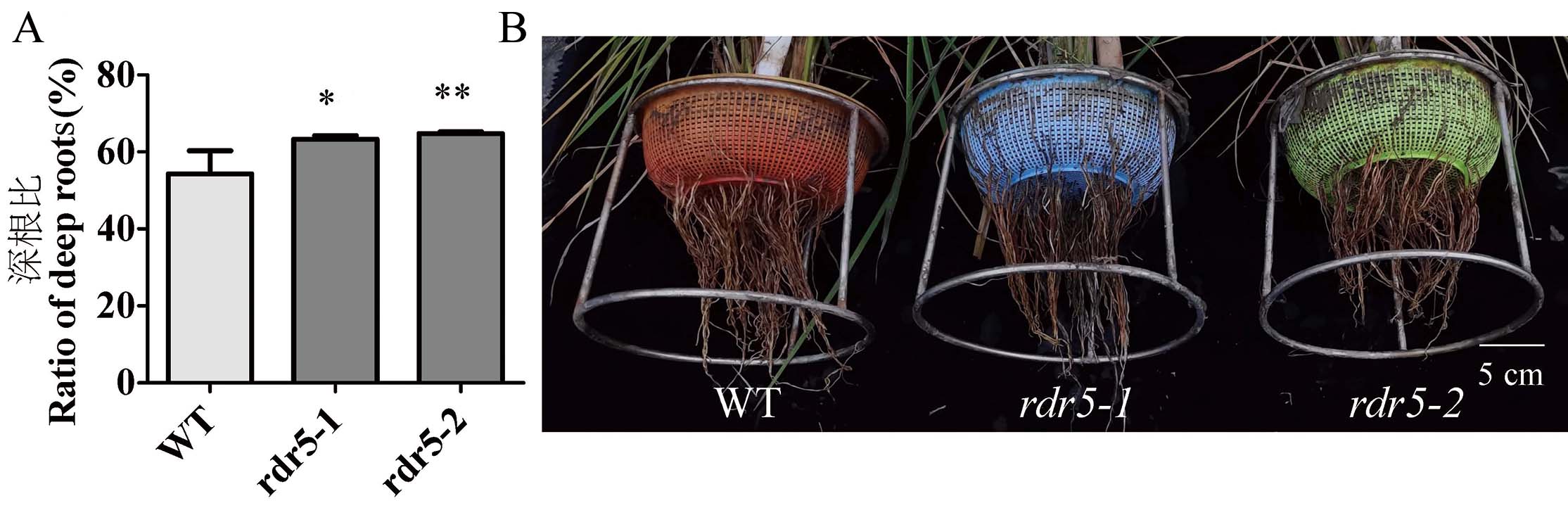 Fig. 8. Ratios of deep rooting of WT and rdr5 mutants A, Deep root ratio and root distribution map of WT and rdr5 lines. The deep root ratio = Number of deep roots/total number of roots; Data are shown as mean ± SD, (n = 12); *,** indicate significance at levels of 0.05, 0.01 by independent t-test, respectively.