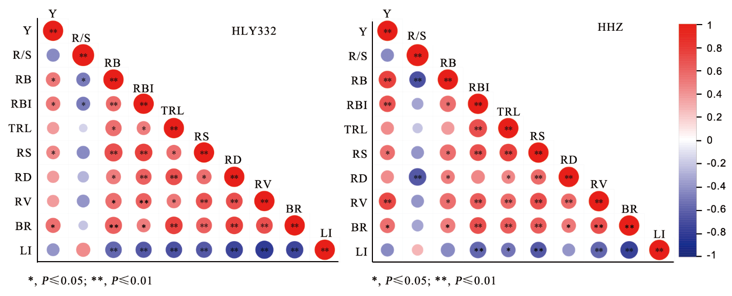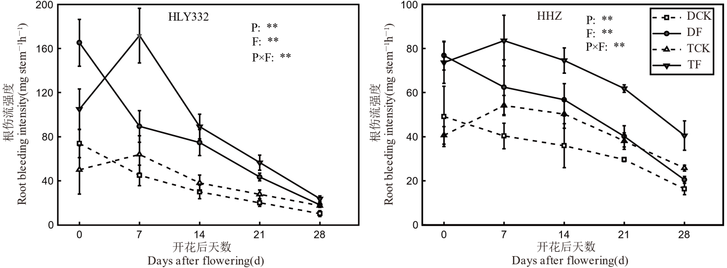 【目的】明确种植方式和施肥对水稻根系形态、生长发育及产量形成的影响,为水稻的种植及科学施肥提供理论依据。【方法】以杂交稻和两优332(HLY332)和常规稻黄华占(HHZ)为材料,采用双因素试验设计,即种植方式(直播和移栽)和施肥(不施肥和施肥),研究水稻的根系分布、根系形态、根系活力和抗倒伏能力等对种植方式和施肥的响应。【结果】1)与不施肥处理相比,HLY332在直播和移栽条件下,施肥处理的产量分别提高了15.3%和15.0%;HHZ分别提高了18.6%和22.1%。HLY332和HHZ在不同种植方式下的产量均无显著差异。2)直播的根系主要分布在0~5 cm的土层,直播条件下,HLY332不施肥和施肥处理在0~5 cm土层的平均根系生物量占比分别为50.1%和56.8%,HHZ分别为63.5%和67.0%;而移栽水稻的根系则主要分布在5~10 cm的土层,HLY332不施肥和施肥处理在5~10 cm土层的平均根系生物量占比分别为42.9%和41.9%,HHZ分别为53.2%和49.1%。与不施肥处理相比,HLY332直播和移栽条件下,施肥处理的根系生物量分别增加了46.9%和45.9%;HHZ分别增加了64.9%和56.9%。与不施肥处理相比,HLY332直播和移栽条件下,施肥处理的根伤流强度分别增加了113.3%和110.6%;HHZ分别增加了46.1%和60.8%。3)相比于直播,移栽时水稻具有较强的抗折力,与直播处理相比,HLY332不施肥和施肥条件下,移栽处理的抗折力分别增加了23.9%和15.2%;HHZ分别增加了12.5%和17.0%。与不施肥处理相比,HLY332直播和移栽条件下,施肥处理的抗折力分别增加了25.5%和16.8%;HHZ分别增加了23.7%和28.6%。【结论】水稻根系在土层中的分布不同是直播和移栽水稻根系性状差异的显著特征。在本研究条件下,直播或移栽的种植方式下,施肥均能够显著改善根系形态,提高水稻产量,且直播和移栽之间无显著差异。因此,在当前人们对轻简化种植迫切需求的形势下,采用直播种植方式和科学施肥技术相结合是可行的。
