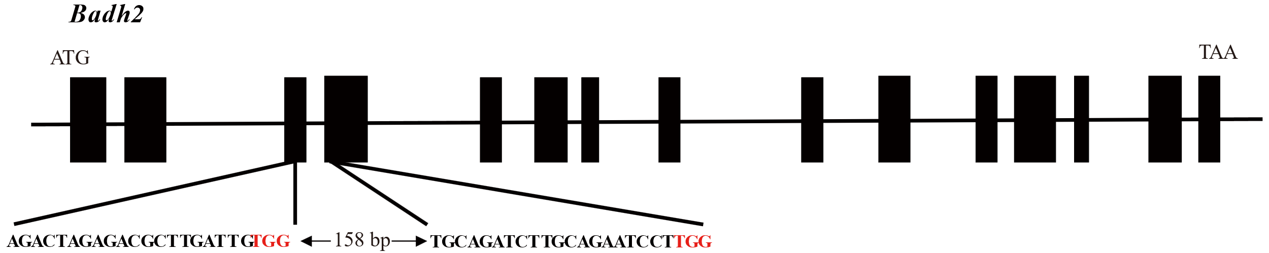 Fig. 1. Schematic diagram of Badh2 and target sites Red letters represent protospacer adjacent motif (PAM) sequence; Black boxes represent exons.