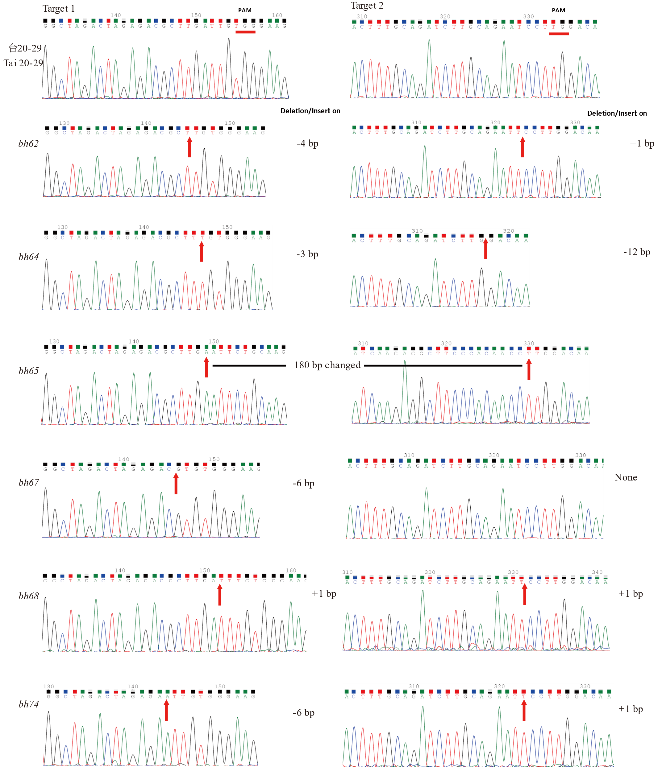 图3 6种香味突变体与野生型靶位点序列比对 红色横线标出PAM序列,箭头表示突变碱基位置。