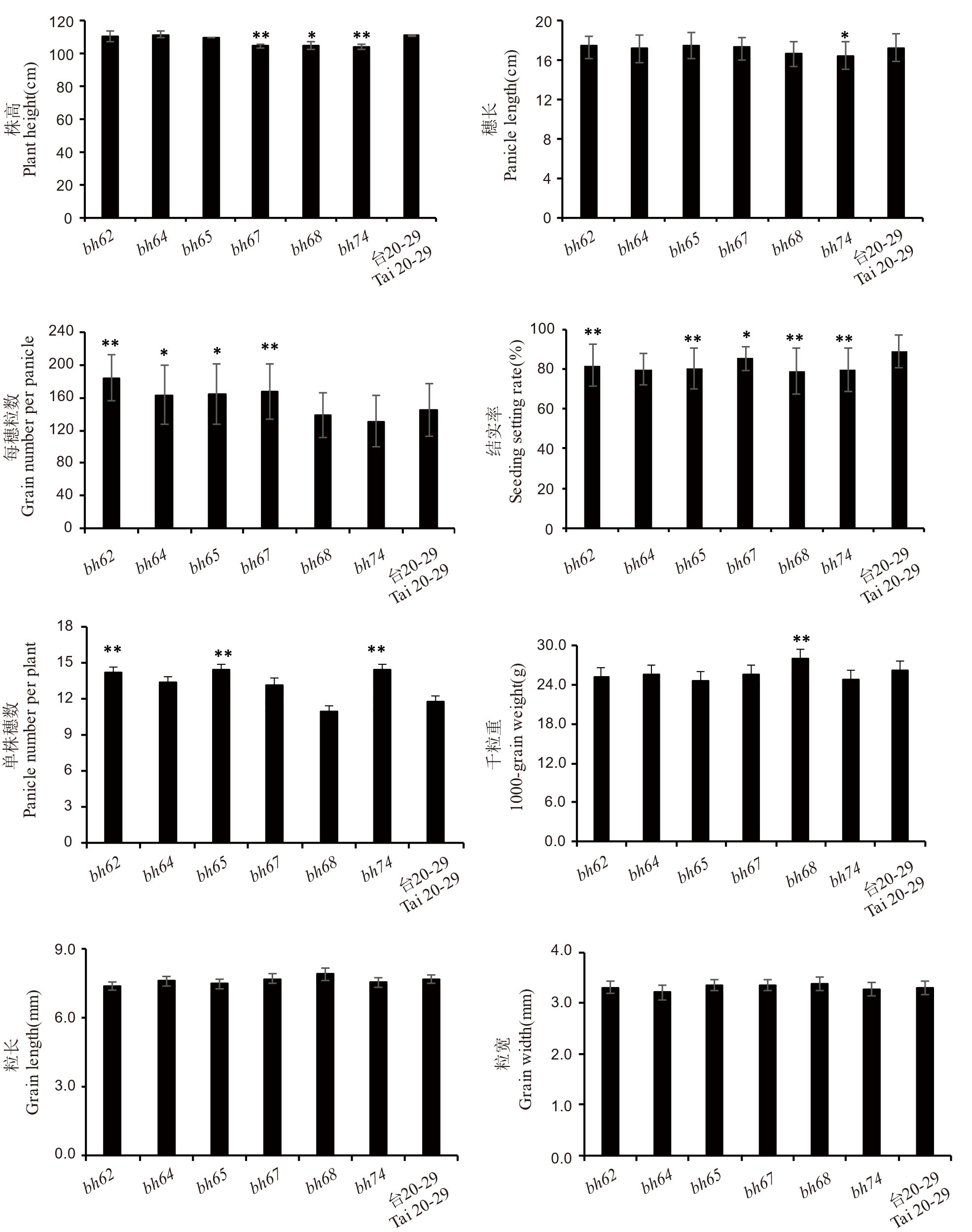 Fig. 4. Agronomic traits of six aromatic mutants and wild type Values are shown as mean±SD. Sample sizes n=5 for plant height, panicle number per plant and 1000-grain weight, n=15 for the rest factors. **and * indicate significant difference between mutants and the wild type at 0.01 and 0.05, respectively.