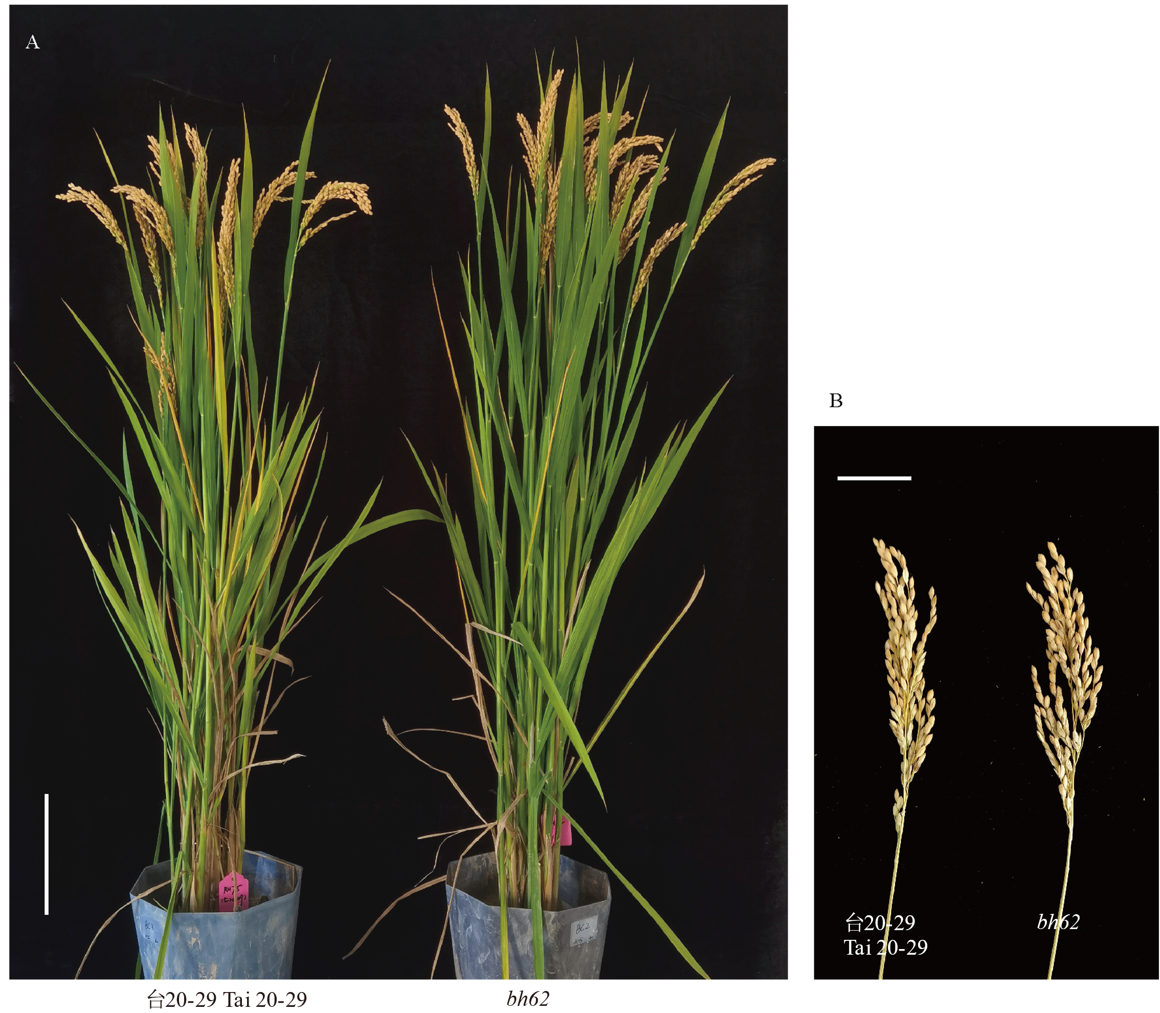 Fig. 5. Phenotypic comparison during mature stage between the mutant bh62 and its wild type Tai 20-29 A, Plant comparison, bar=20 cm; B, Panicle comparison, bar=5 cm.