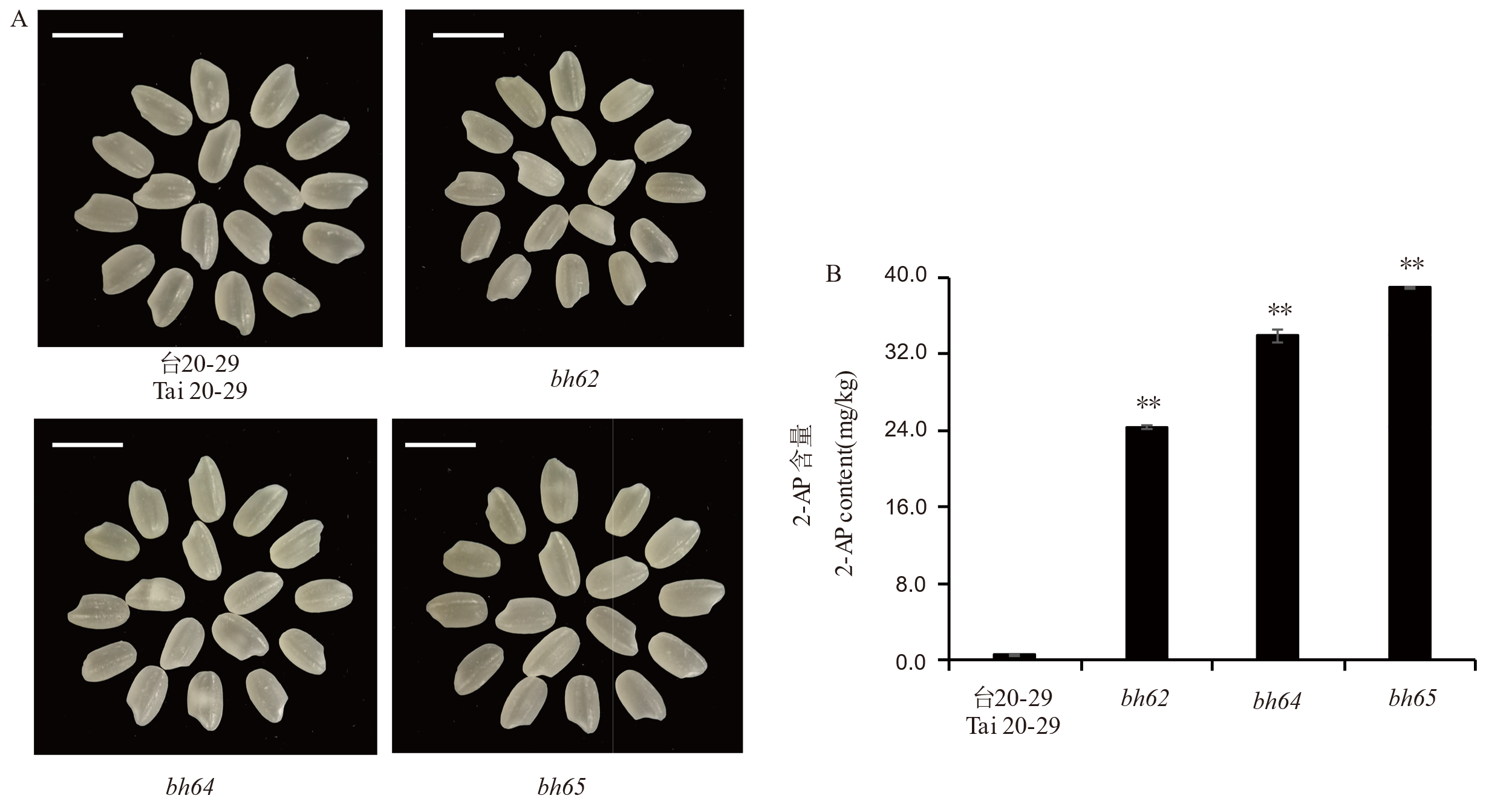 图6 香味突变体与野生型的稻米表型(A)及糙米中2-AP含量(B) 比例尺为1 cm。B图中数据测定重复3次,**表示与野生型相比,P<0.01。