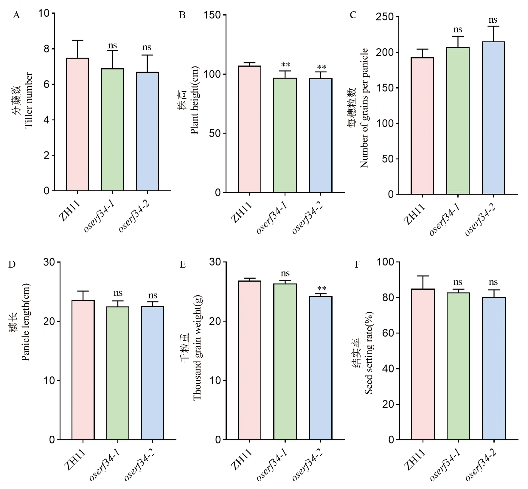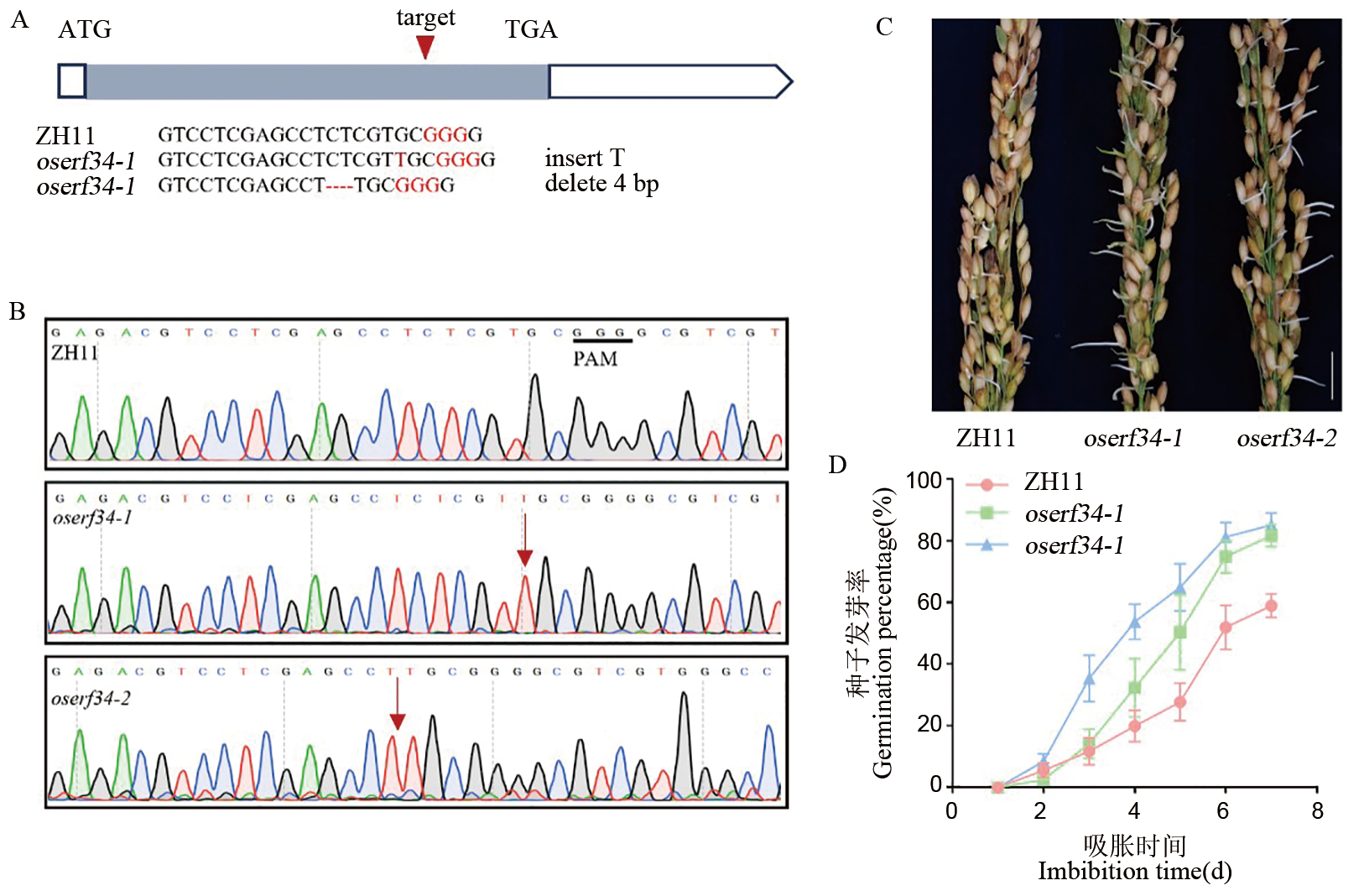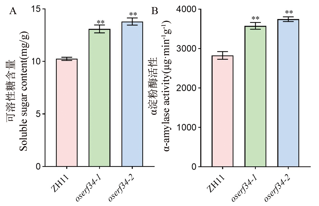 【目的】水稻种子休眠性变弱会导致收获前穗发芽(PHS),严重影响水稻的产量与品质,因而研究水稻种子休眠性的遗传调控机制至关重要。【方法】以中花11为背景通过CRISPR/Cas9技术创制水稻AP2/ERF转录因子OsERF34功能缺失突变体,结合转录组、激素代谢组及生理生化分析,解析其调控种子休眠的分子途径。【结果】发现oserf34突变体种子穗发芽严重,休眠性极显著减弱。转录组分析显示,oserf34与野生型之间差异表达基因(DEGs)显著富集于植物激素信号转导、ROS代谢及糖酵解通路,表明OsERF34可能通过调控激素合成与代谢、氧化还原平衡及糖代谢,维持种子休眠状态。进一步研究发现,oserf34突变体种子中生长素(IAA)、赤霉素(GA19/GA20)及水杨酸(SA)含量显著升高,而ROS清除剂脯氨酸含量降低,过氧化氢(H2O2)和超氧阴离子积累加剧,同时抗氧化酶(SOD、POD、CAT)活性上调。此外,突变体胚乳中可溶性糖含量和α-淀粉酶活性显著升高,为打破休眠提供能量基础。【结论】OsERF34通过参与激素合成与代谢、氧化还原平衡及糖代谢正向调控水稻种子休眠,为解析水稻种子休眠与萌发分子机制及创制抗穗发芽水稻新品种提供了新的理论依据与遗传资源。