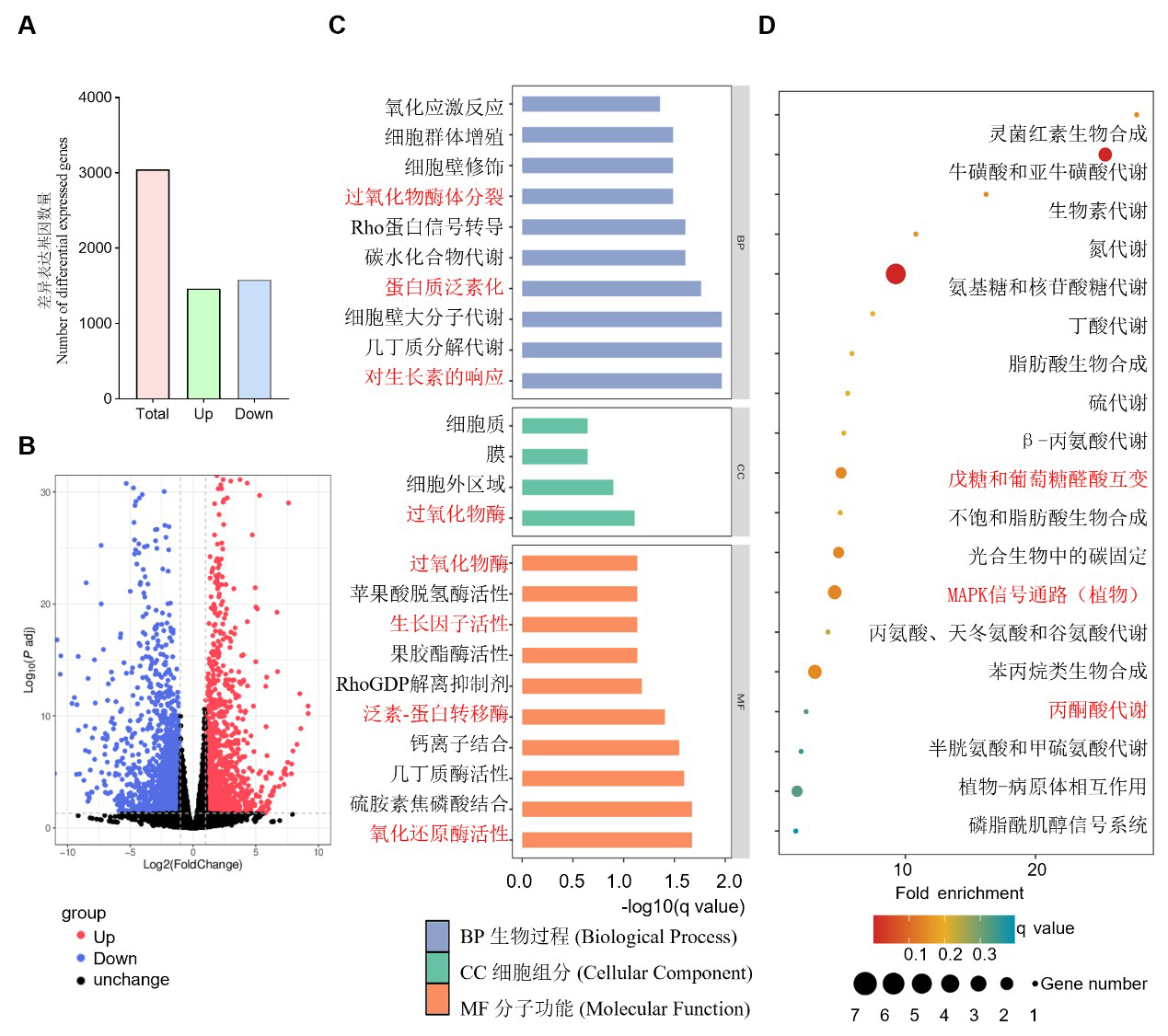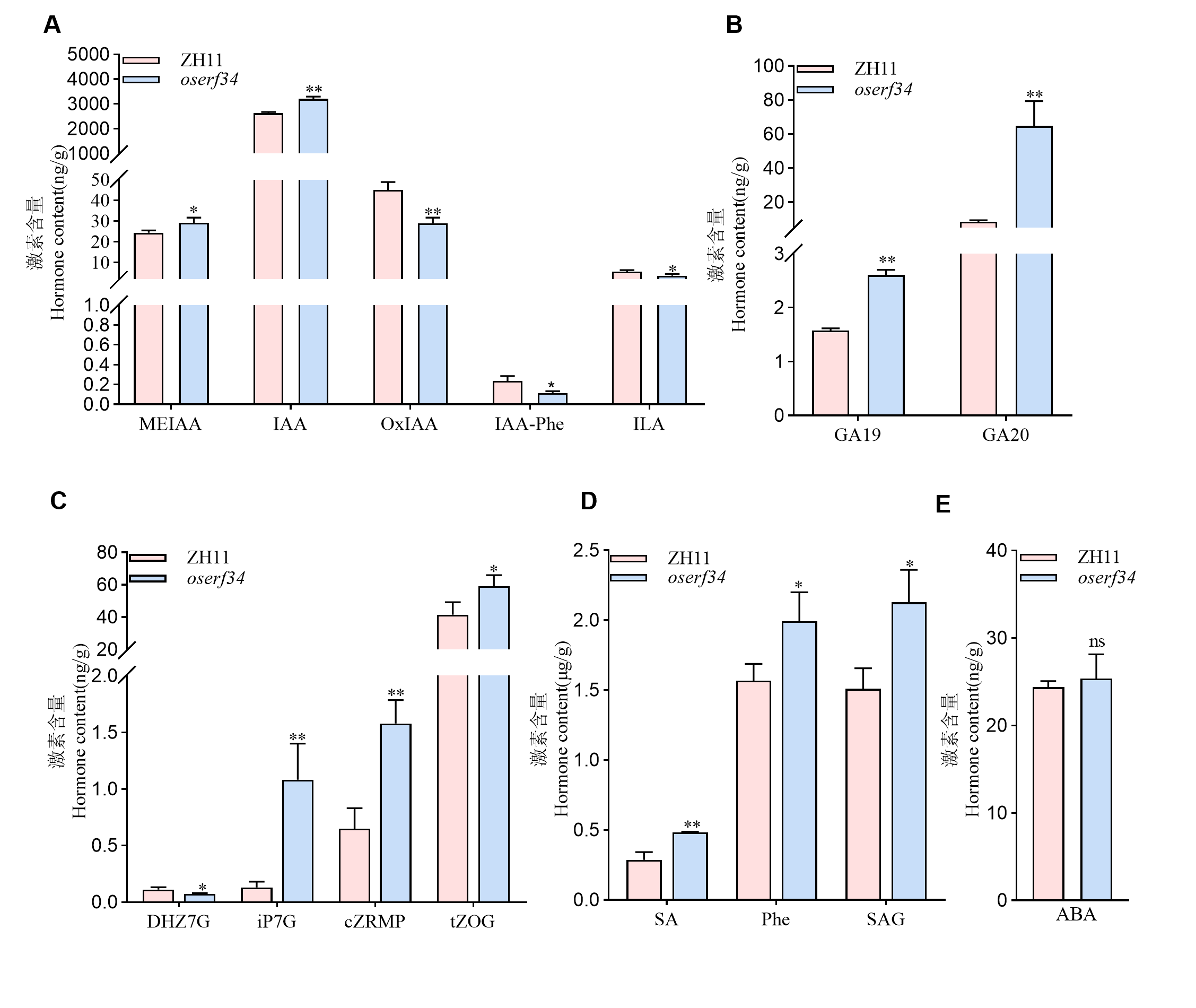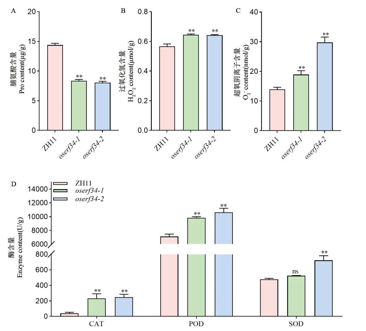 【目的】水稻种子休眠性变弱会导致收获前穗发芽(PHS),严重影响水稻的产量与品质,因而研究水稻种子休眠性的遗传调控机制至关重要。【方法】以中花11为背景通过CRISPR/Cas9技术创制水稻AP2/ERF转录因子OsERF34功能缺失突变体,结合转录组、激素代谢组及生理生化分析,解析其调控种子休眠的分子途径。【结果】发现oserf34突变体种子穗发芽严重,休眠性极显著减弱。转录组分析显示,oserf34与野生型之间差异表达基因(DEGs)显著富集于植物激素信号转导、ROS代谢及糖酵解通路,表明OsERF34可能通过调控激素合成与代谢、氧化还原平衡及糖代谢,维持种子休眠状态。进一步研究发现,oserf34突变体种子中生长素(IAA)、赤霉素(GA19/GA20)及水杨酸(SA)含量显著升高,而ROS清除剂脯氨酸含量降低,过氧化氢(H2O2)和超氧阴离子积累加剧,同时抗氧化酶(SOD、POD、CAT)活性上调。此外,突变体胚乳中可溶性糖含量和α-淀粉酶活性显著升高,为打破休眠提供能量基础。【结论】OsERF34通过参与激素合成与代谢、氧化还原平衡及糖代谢正向调控水稻种子休眠,为解析水稻种子休眠与萌发分子机制及创制抗穗发芽水稻新品种提供了新的理论依据与遗传资源。