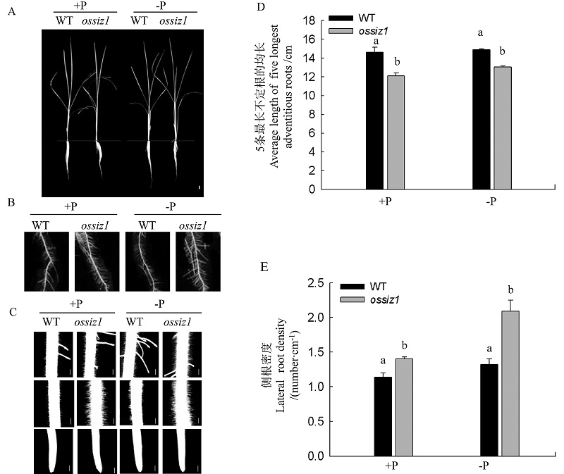 图2 正常供磷(+P)和缺磷(-P)固体培养基中野生型和ossiz1根系的表型分析 A、C中白色线条分别表示1 cm,2 cm。