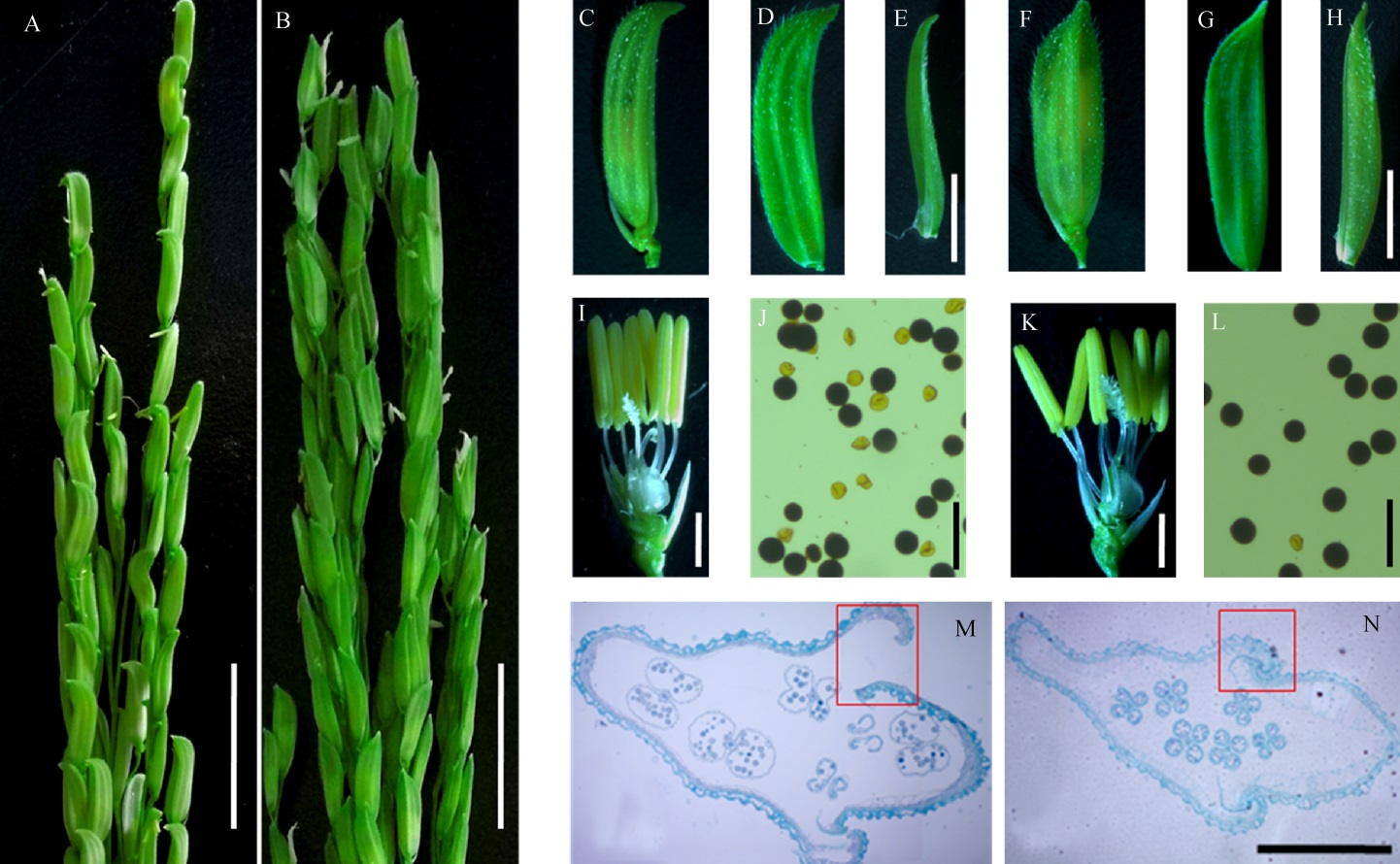 Fig. 1. Phenotypic analysis of floret organs in blg1 mutant and Z1803. A and B, Spikelets of blg1 and Z1803, respectively(Bar=2 cm); C, D, and E, Floret, lemma, palea of blg1, respectively(Bar=3 mm); F, G and H, Floret, lemma, palea of Z1803, respectively(Bar=3 mm); I and K, Internal floral organs of blg1 and Z1803, respectively(Bar=1.5 mm); J and L, Pollen staining of blg1 and Z1803, respectively(Bar=100 μm); M and N, Paraffin section of floret transection of blg1 and Z1803, respectively(Bar=1 mm).