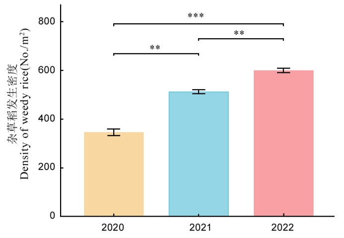 Fig. 1. Dynamics of weedy rice occurrence density across years ** and *** indicate significant difference at the levels of 0.01 and 0.001, respectively(t-test).