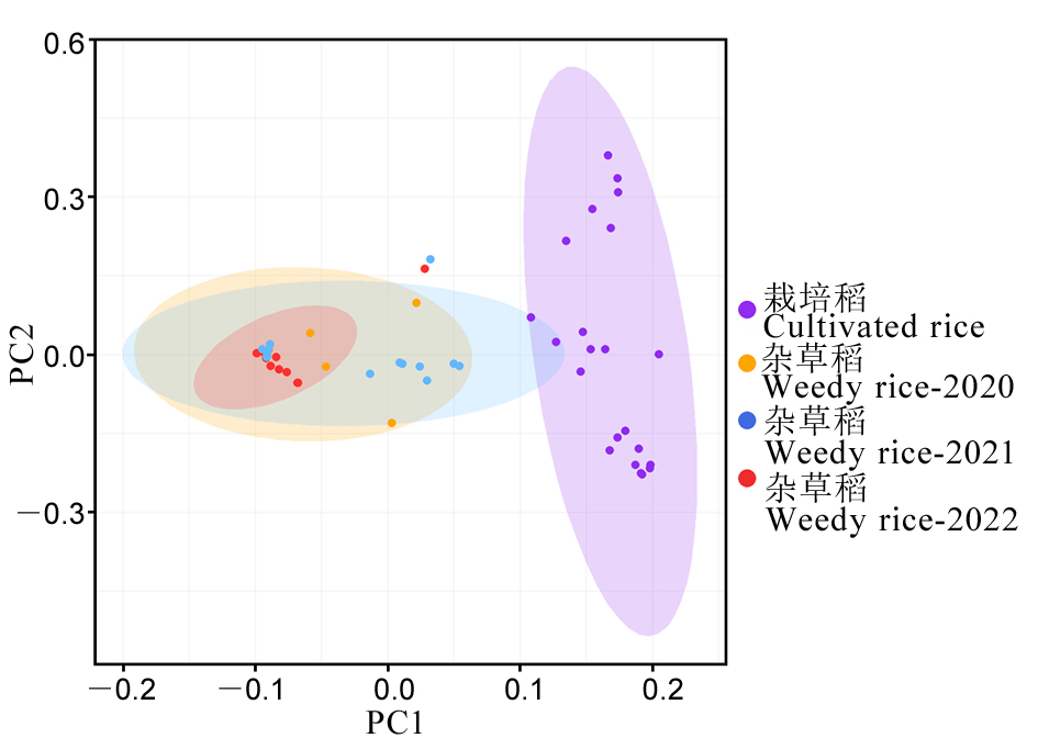 【目的】 杂草稻造成直播稻田水稻产量损失严重。对直播稻田中杂草稻种群的发生规律、多样性变化和遗传演变的解析,对农田生态系统管理和杂草稻灾害的防控具有重要意义。【方法】 连续三年对新开直播稻田生态系统中杂草稻种群进行追踪调查。通过定点追踪取样、特征表型鉴定和基于液相芯片的群体遗传结构鉴定,分析杂草稻群体的危害规模、生态类型及其遗传多样性演变。【结果】 水稻直播生产方式下杂草稻数量逐年增加,分别为345.6株/m2、512.4株/m2、600.1株/m2。表型多样性也呈逐年上升趋势,香农指数分别为0.530、0.762、0.852;辛普森指数分别为0.340、0.227、0.164。杂草稻群体的基因多样性(Pi)在三年间呈现先升高后降低的趋势,分别为0.2097、0.2530、0.1493。在群体遗传结构层面,主成分分析与进化树分析结果均显示杂草稻与当地种植的栽培稻没有直接的亲缘关系。不同年度间采集的杂草稻样品在各大聚类分支上均有分布。不同类型杂草稻在高纬度冷凉环境以及与直播稻竞争的双重选择压力下优胜劣汰,导致群体遗传多样性增加后迅速收敛,群体遗传结构随之改变,适应性类型崛起。【结论】 在直播稻新开田生态系统中,杂草稻入侵后群体规模与多样性迅速上升,导致灾害指数迅速增加。基因多样性与群体遗传结构对选择压力高度敏感,产生危害的适应类型杂草稻在入侵直播稻田生态系统伊始就已经奠定。