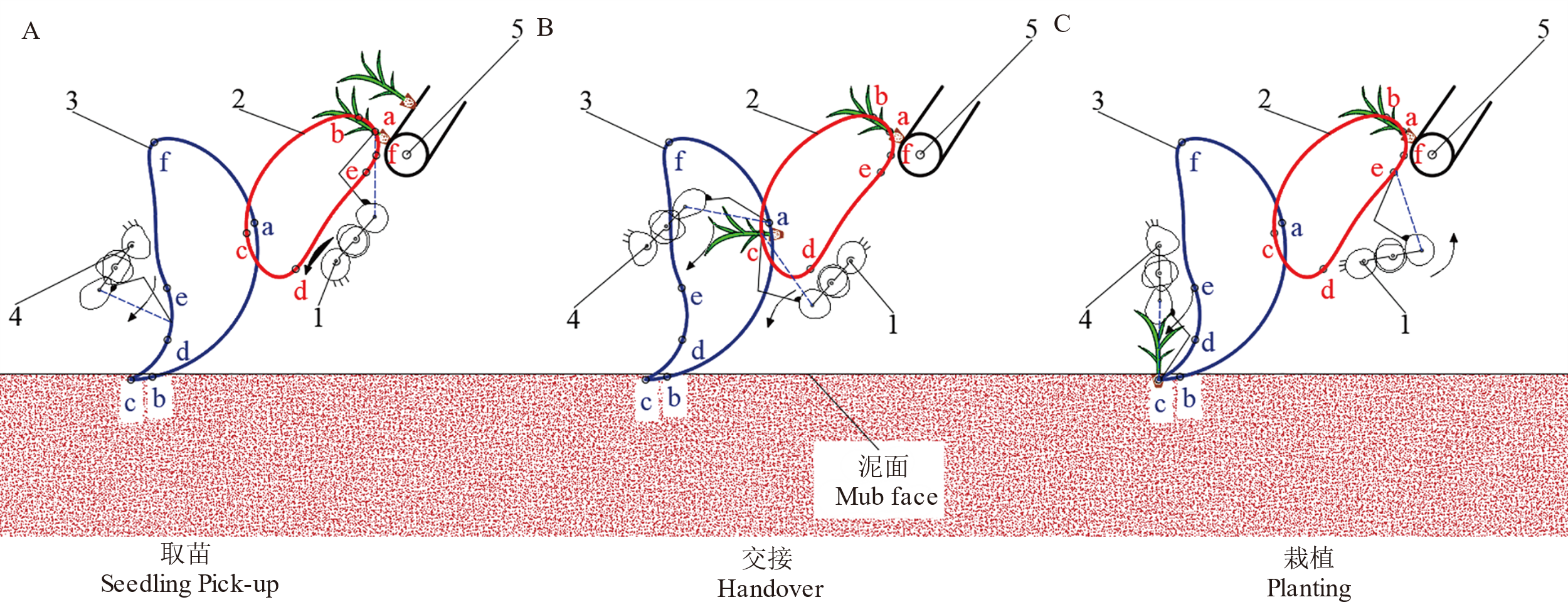 图1 取苗,交接和栽植过程示意图 1 : 取苗机构; 2: 取苗轨迹; 3: 栽植轨迹; 4: 栽植机构; 5: 秧箱。