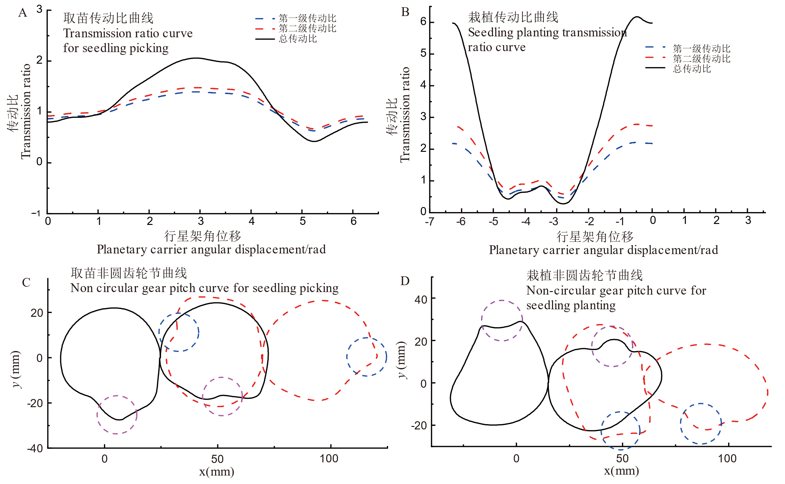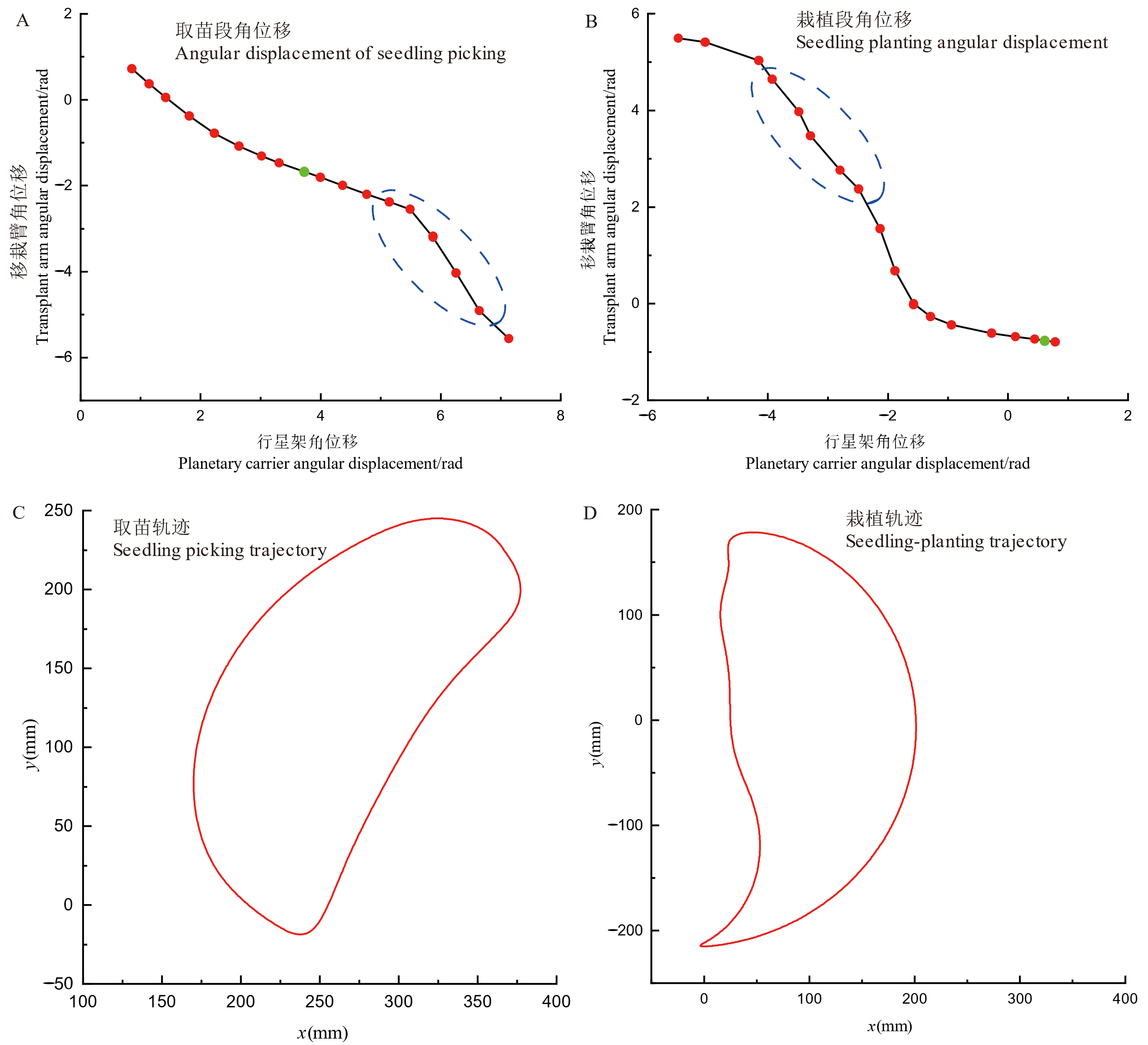 【目的】针对现有取苗与栽植一体式移栽机构作业时夹带泥土影响二次取苗及秧苗栽插直立度的问题,本研究提出了一种取苗与栽植双机构协同作业的水稻钵苗移栽方式。【方法】首先,结合钵苗夹取、交接、栽植要求,设定移栽过程的若干关键位姿点作为取与栽植动作的约束条件,规划运动轨迹;依据杆长不变原理构建平面2R机构多位姿近似运动综合模型,采用粒子群优化(PSO)算法求解机构两转动副的最优布局,确定杆长,并建立了交接段的几何约束;结合转动副位置与杆长参数复演运动轨迹,求解两构件相对角位移,获取非圆齿轮传动比。为改善非圆齿轮节曲线凹凸性,建立节曲线圆度系数目标函数,利用PSO算法实现非圆齿轮圆度优化,完成取苗与栽植两轮系机构的设计。【结果】对机构的仿真分析与台架试验表明:机构实际运动轨迹与理论轨迹最大偏差小于1.8 mm,关键位姿夹取角度误差不超过1.2 °,移栽成功率可达88.7%。【结论】本研究采用取栽分离协同作业模式,可有效解决传统机构夹带泥土导致的移栽效果不佳问题,为高效水稻钵苗移栽装备研发提供了新的理论依据。