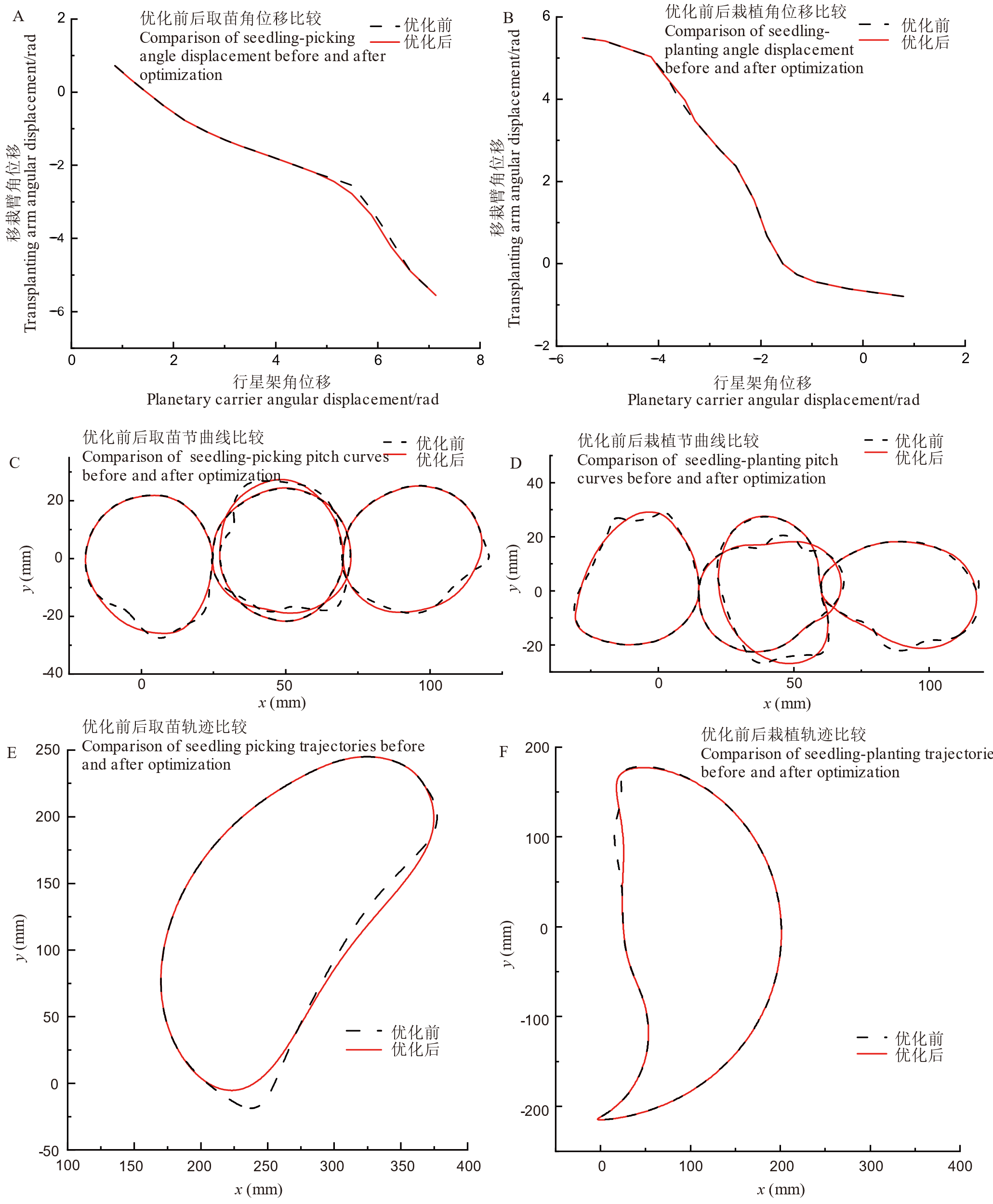 图11 取栽机构角位移-节曲线-轨迹优化前后对比