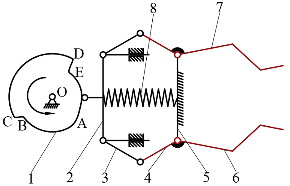 图7 移栽部件结构 1 : 凸轮; 2: 凸轮顶杆; 3: 杆一; 4: 杆二; 5: 固定杆; 6: 夹片A; 7: 夹片B; 8: 弹簧。